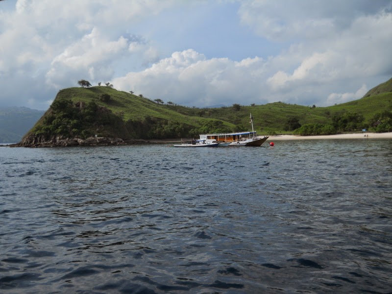| Pláž z menší dálky. Překvapivě Indonésané v národním parku nekotví a neničí tak ty nádherné korály! Takže se kotví k bójkám a celé to tam organizuje tato loď. |
